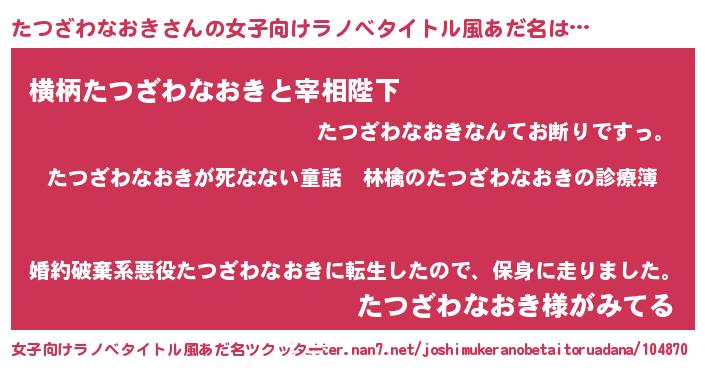 | 男性向けラノベタイトル風あだ名 | 『魔弾の王とたつざわなおき』 |