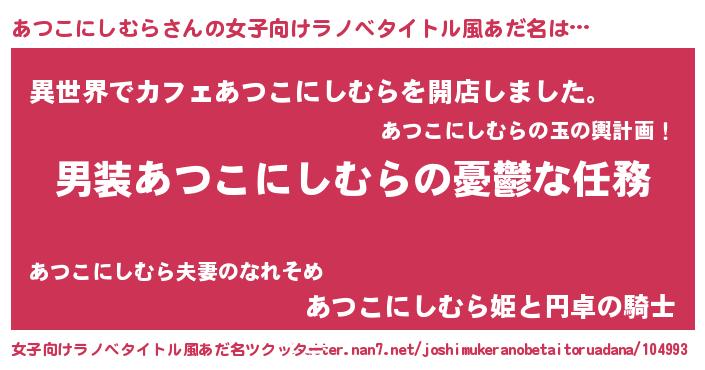 | 男性向けラノベタイトル風あだ名 | 『うちのあつこにしむらが世界を掌握している!』 |