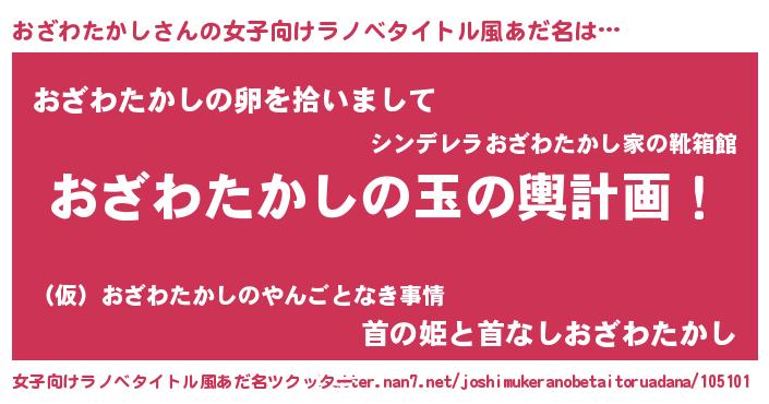 | 男性向けラノベタイトル風あだ名 | 『転生したらおざわたかしだった件』 |