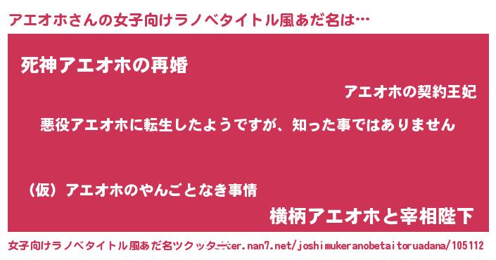 | 男性向けラノベタイトル風あだ名 | 『この素晴らしい世界にアエオホを!』 |