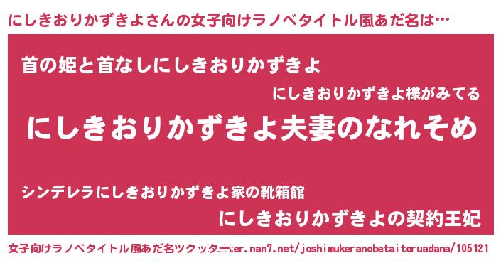 | 男性向けラノベタイトル風あだ名 | 『おまえをオタクにしてやるから、俺をにしきおりかずきよにしてくれ! 』 |