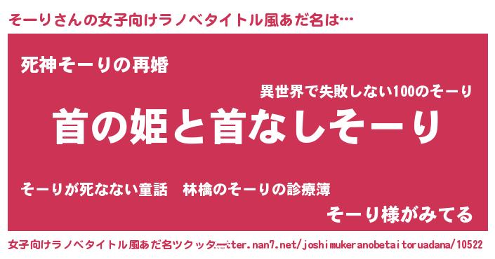そーりさんの女子向けラノベタイトル風あだ名は… 『首の姫と首なしそーり』『死神そーりの再婚』『そーり様がみてる』 ツクッター #女子向けラノベタイトル風あだ名ツクッター http://tkutter.nan7.net/joshimukeranobetaitoruadana/10522/