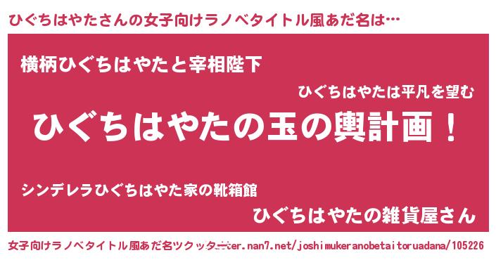 | 男性向けラノベタイトル風あだ名 | 『ひぐちはやた~年齢イコール彼女いない歴の魔法使い~』 |