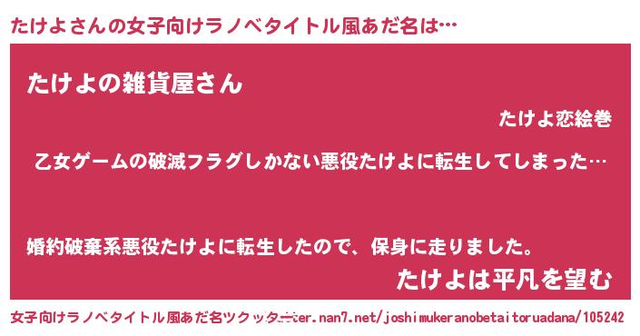 | 男性向けラノベタイトル風あだ名 | 『この素晴らしい世界にたけよを!』 |