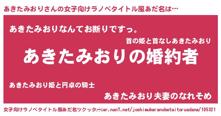 あきたみおりさんの女子向けラノベタイトル風あだ名は… 『あきたみおりの婚約者』『あきたみおりなんてお断りですっ。』『あきたみおり夫妻のなれそめ』 ツクッター #女子向けラノベタイトル風あだ名ツクッター http://tkutter.nan7.net/joshimukeranobetaitoruadana/105321/