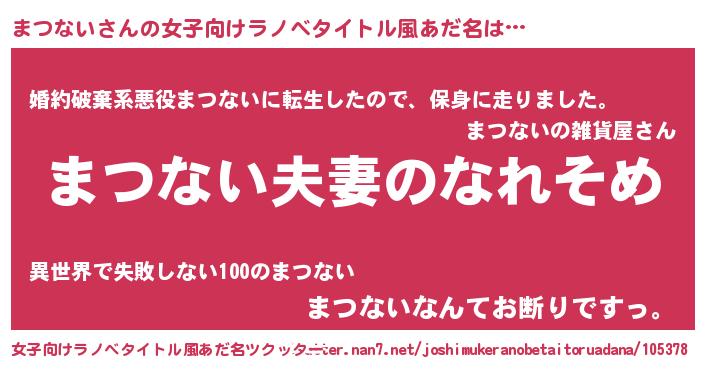 | 男性向けラノベタイトル風あだ名 | 『おまえをオタクにしてやるから、俺をまつないにしてくれ! 』 |