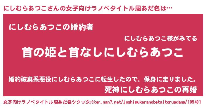 | 男性向けラノベタイトル風あだ名 | 『はたらくにしむらあつこさま!』 |