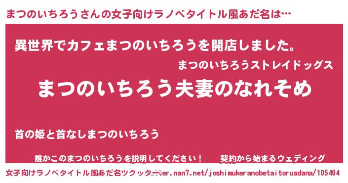 まつのいちろうさんの女子向けラノベタイトル風あだ名は… 『まつのいちろう夫妻のなれそめ』『異世界でカフェまつのいちろうを開店しました。』『誰かこのまつのいちろうを説明してください! ~契約から始まるウェディング~』 ツクッター #女子向けラノベタイトル風あだ名ツクッター http://tkutter.nan7.net/joshimukeranobetaitoruadana/105404/