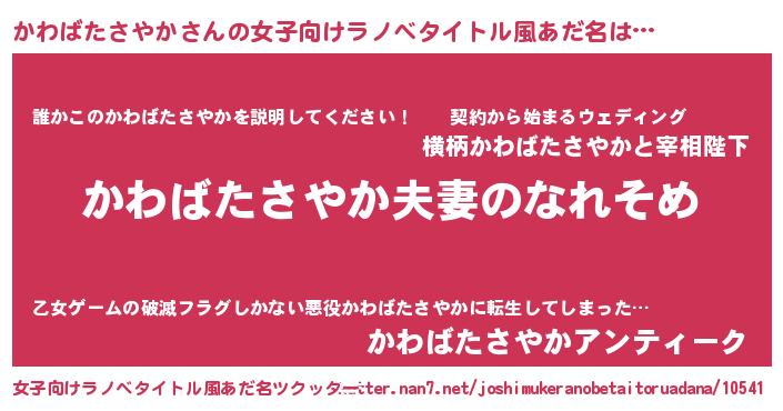 | 男性向けラノベタイトル風あだ名 | 『おまえをオタクにしてやるから、俺をかわばたさやかにしてくれ! 』 |