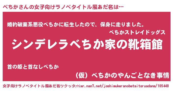 べちかさんの女子向けラノベタイトル風あだ名は… 『シンデレラべちか家の靴箱館』『婚約破棄系悪役べちかに転生したので、保身に走りました。』『(仮)べちかのやんごとなき事情』 ツクッター #女子向けラノベタイトル風あだ名ツクッター http://tkutter.nan7.net/joshimukeranobetaitoruadana/105448/