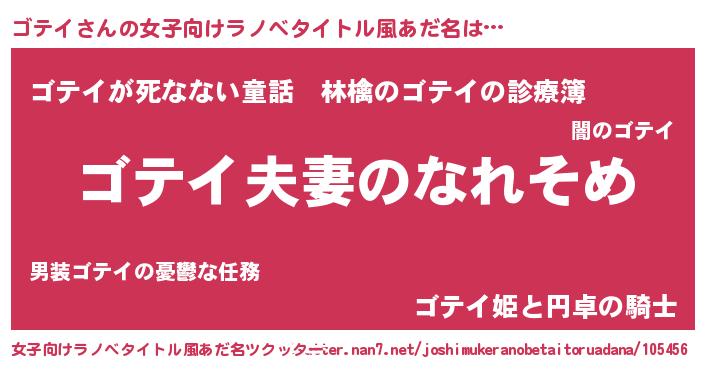 | 男性向けラノベタイトル風あだ名 | 『おまえをオタクにしてやるから、俺をゴテイにしてくれ! 』 |