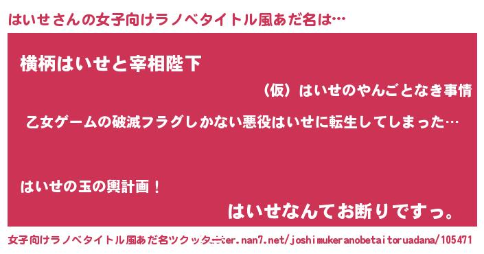 | 男性向けラノベタイトル風あだ名 | 『この素晴らしい世界にはいせを!』 |