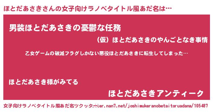 | 男性向けラノベタイトル風あだ名 | 『魔弾の王とほとだあさき』 |