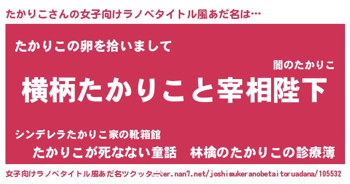 | 男性向けラノベタイトル風あだ名 | 『たかりこに滅ぼされるだけの簡単なお仕事です』 |