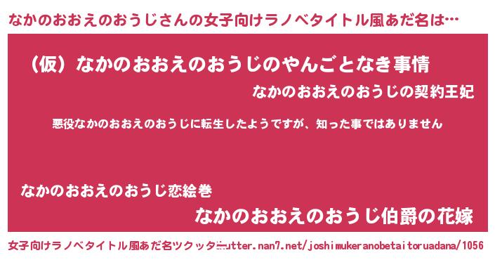 | 男性向けラノベタイトル風あだ名 | 『この素晴らしい世界になかのおおえのおうじを!』 |