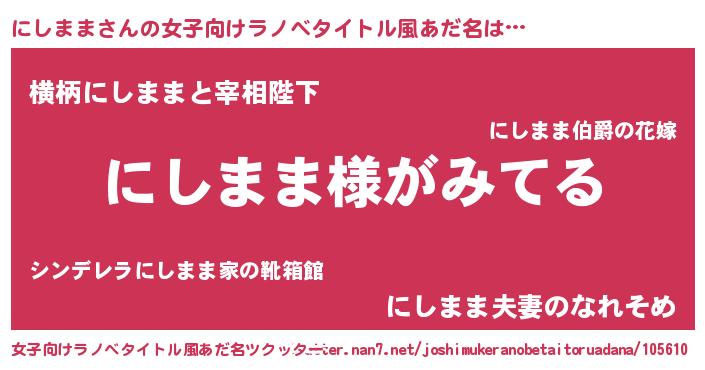 | 男性向けラノベタイトル風あだ名 | 『にしままの嫁は女の子じゃないと思った?』 |