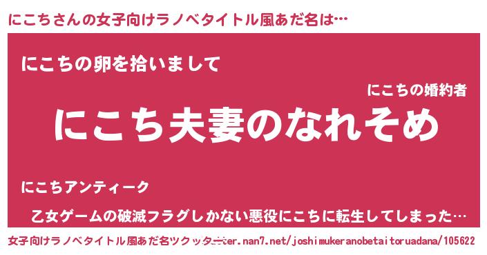 | 男性向けラノベタイトル風あだ名 | 『おまえをオタクにしてやるから、俺をにこちにしてくれ! 』 |