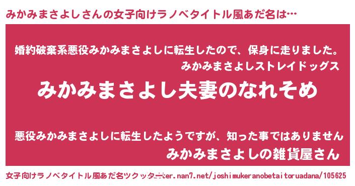 | 男性向けラノベタイトル風あだ名 | 『おまえをオタクにしてやるから、俺をみかみまさよしにしてくれ! 』 |