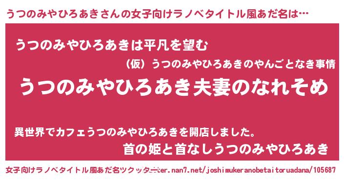 | 男性向けラノベタイトル風あだ名 | 『おまえをオタクにしてやるから、俺をうつのみやひろあきにしてくれ! 』 |