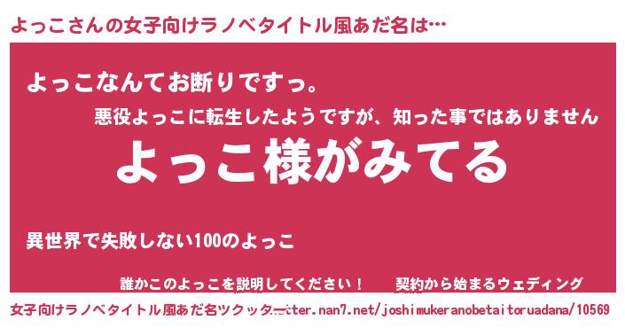 よっこさんの女子向けラノベタイトル風あだ名は… 『よっこ様がみてる』『よっこなんてお断りですっ。』『誰かこのよっこを説明してください! ~契約から始まるウェディング~』 ツクッター #女子向けラノベタイトル風あだ名ツクッター http://tkutter.nan7.net/joshimukeranobetaitoruadana/10569/