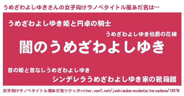うめざわよしゆきさんの女子向けラノベタイトル風あだ名は… 『闇のうめざわよしゆき』『うめざわよしゆき姫と円卓の騎士』『シンデレラうめざわよしゆき家の靴箱館』 ツクッター #女子向けラノベタイトル風あだ名ツクッター http://tkutter.nan7.net/joshimukeranobetaitoruadana/10576/