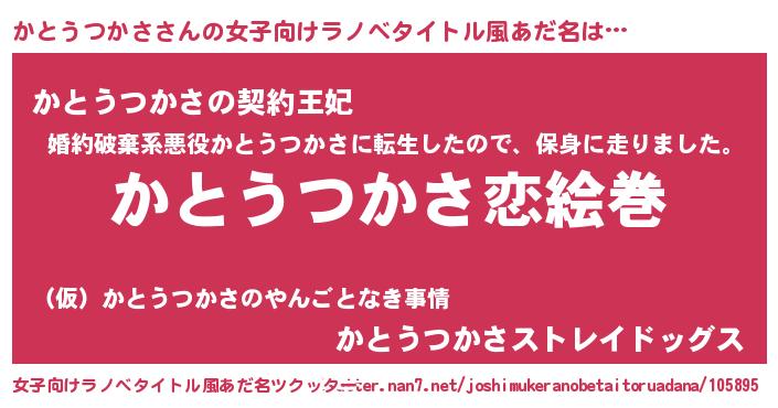 | 男性向けラノベタイトル風あだ名 | 『ノーゲーム・ノーカトウツカサ』 |