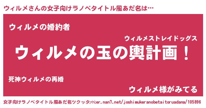 | 男性向けラノベタイトル風あだ名 | 『ウィルメ~年齢イコール彼女いない歴の魔法使い~』 |