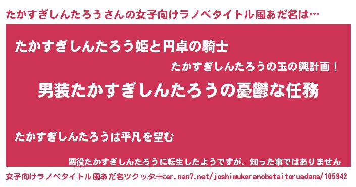 | 男性向けラノベタイトル風あだ名 | 『うちのたかすぎしんたろうが世界を掌握している!』 |