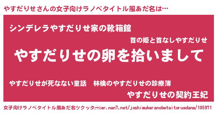 | 男性向けラノベタイトル風あだ名 | 『ダンジョンにやすだりせを求めるのは間違っているだろうか』 |