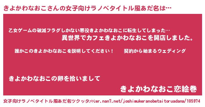 | 男性向けラノベタイトル風あだ名 | 『キヨカワナオコアートオンライン』 |