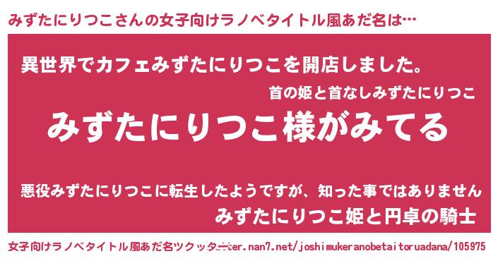 | 男性向けラノベタイトル風あだ名 | 『みずたにりつこの嫁は女の子じゃないと思った?』 |