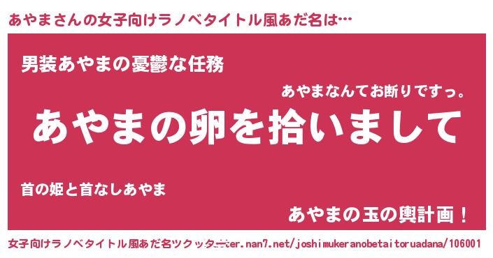| 男性向けラノベタイトル風あだ名 | 『あやまの嫁は女の子じゃないと思った?』 |