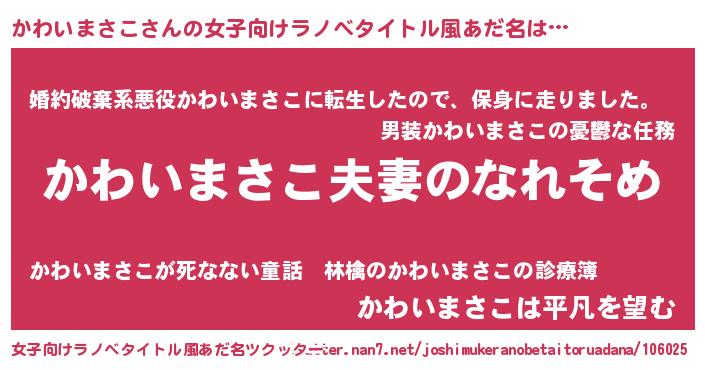 | 男性向けラノベタイトル風あだ名 | 『おまえをオタクにしてやるから、俺をかわいまさこにしてくれ! 』 |