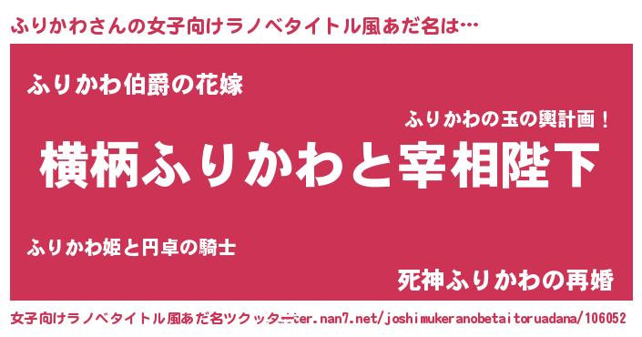 | 男性向けラノベタイトル風あだ名 | 『ふりかわに滅ぼされるだけの簡単なお仕事です』 |