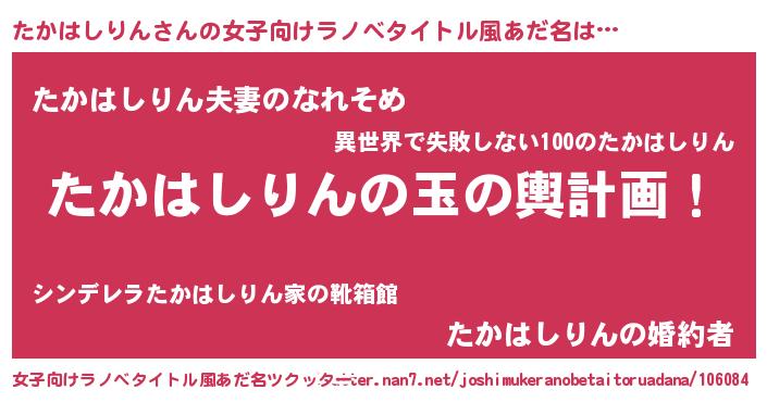 | 男性向けラノベタイトル風あだ名 | 『たかはしりん~年齢イコール彼女いない歴の魔法使い~』 |