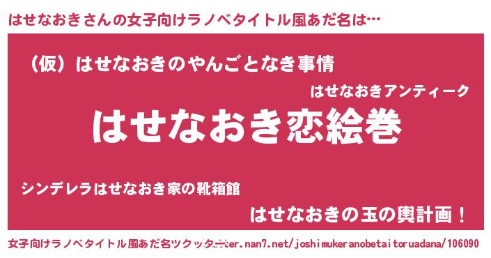 | 男性向けラノベタイトル風あだ名 | 『おまえをオタクにしてやるから、俺をはせなおきにしてくれ! 』 |