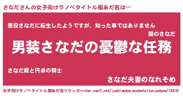 さなださんの女子向けラノベタイトル風あだ名は… 『男装さなだの憂鬱な任務』『悪役さなだに転生したようですが、知った事ではありません』『さなだ夫妻のなれそめ』 ツクッター #女子向けラノベタイトル風あだ名ツクッター http://tkutter.nan7.net/joshimukeranobetaitoruadana/10610/
