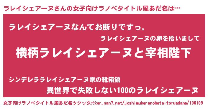 | 男性向けラノベタイトル風あだ名 | 『ラレイシェアーヌに滅ぼされるだけの簡単なお仕事です』 |