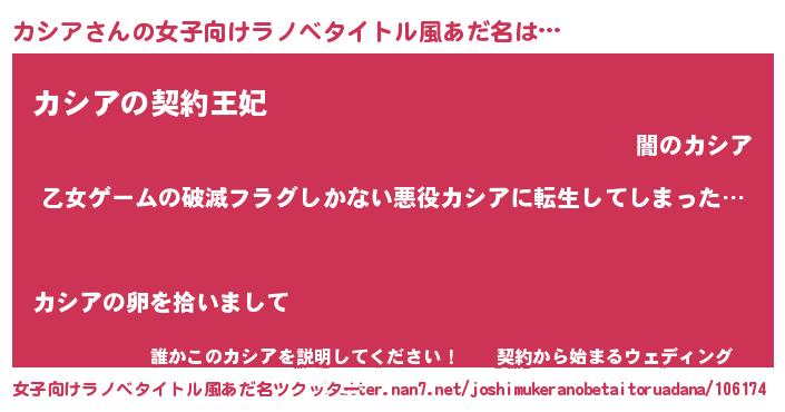 | 男性向けラノベタイトル風あだ名 | 『この素晴らしい世界にカシアを!』 |