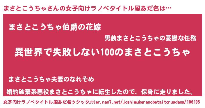 | 男性向けラノベタイトル風あだ名 | 『まさとこうちゃという概念が存在しない退屈な世界 』 |