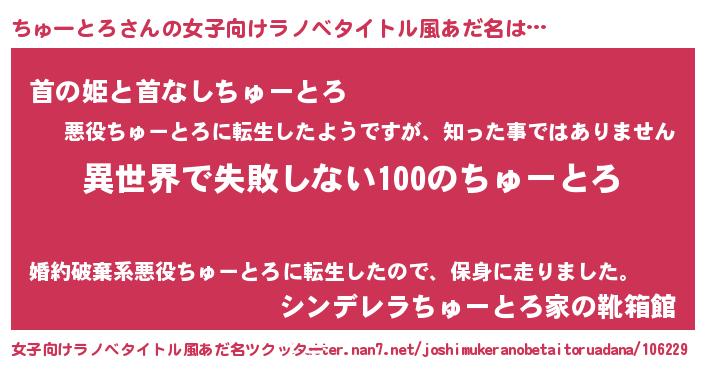 | 男性向けラノベタイトル風あだ名 | 『ちゅーとろという概念が存在しない退屈な世界 』 |