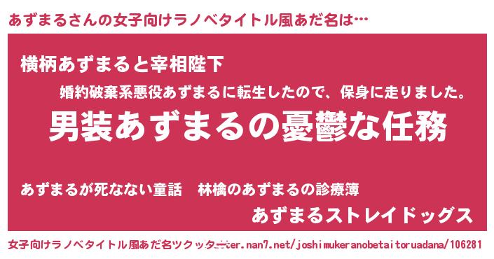 | 男性向けラノベタイトル風あだ名 | 『うちのあずまるが世界を掌握している!』 |