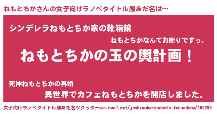 | 男性向けラノベタイトル風あだ名 | 『ねもとちか~年齢イコール彼女いない歴の魔法使い~』 |