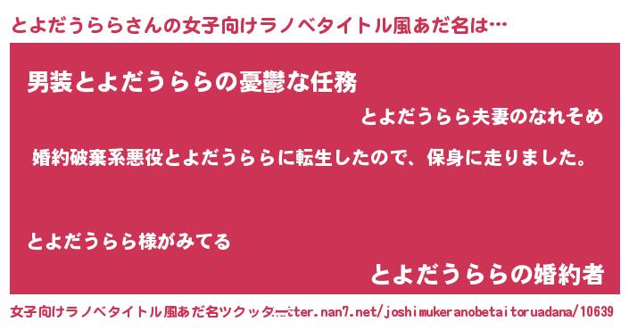 とよだうららさんの女子向けラノベタイトル風あだ名は… 『婚約破棄系悪役とよだうららに転生したので、保身に走りました。』『男装とよだうららの憂鬱な任務』『とよだうららの婚約者』 ツクッター #女子向けラノベタイトル風あだ名ツクッター http://tkutter.nan7.net/joshimukeranobetaitoruadana/10639/