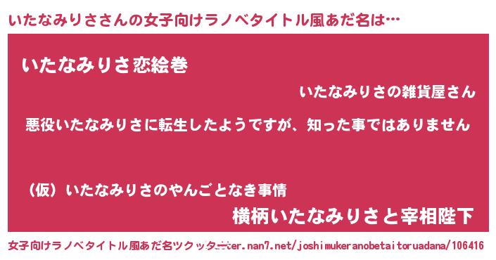 | 男性向けラノベタイトル風あだ名 | 『この素晴らしい世界にいたなみりさを!』 |