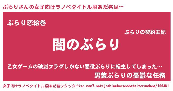 | 男性向けラノベタイトル風あだ名 | 『Re:ぶらりから始める異世界生活』 |