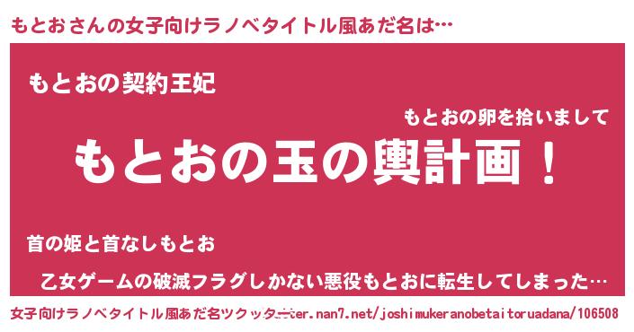 | 男性向けラノベタイトル風あだ名 | 『もとお~年齢イコール彼女いない歴の魔法使い~』 |