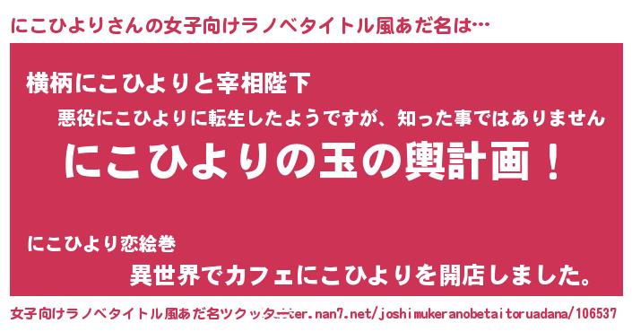 にこひよりさんの女子向けラノベタイトル風あだ名は… 『にこひよりの玉の輿計画!』『横柄にこひよりと宰相陛下』『異世界でカフェにこひよりを開店しました。』 ツクッター #女子向けラノベタイトル風あだ名ツクッター http://tkutter.nan7.net/joshimukeranobetaitoruadana/106537/