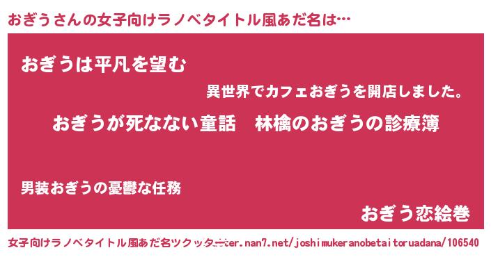 おぎうさんの女子向けラノベタイトル風あだ名は… 『おぎうが死なない童話 林檎のおぎうの診療簿』『おぎうは平凡を望む』『おぎう恋絵巻』 ツクッター #女子向けラノベタイトル風あだ名ツクッター http://tkutter.nan7.net/joshimukeranobetaitoruadana/106540/