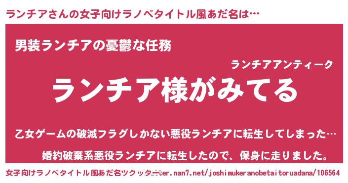 | 男性向けラノベタイトル風あだ名 | 『ランチアの嫁は女の子じゃないと思った?』 |